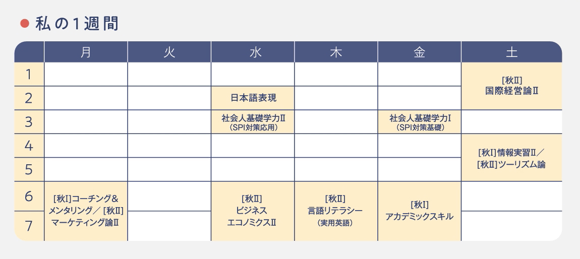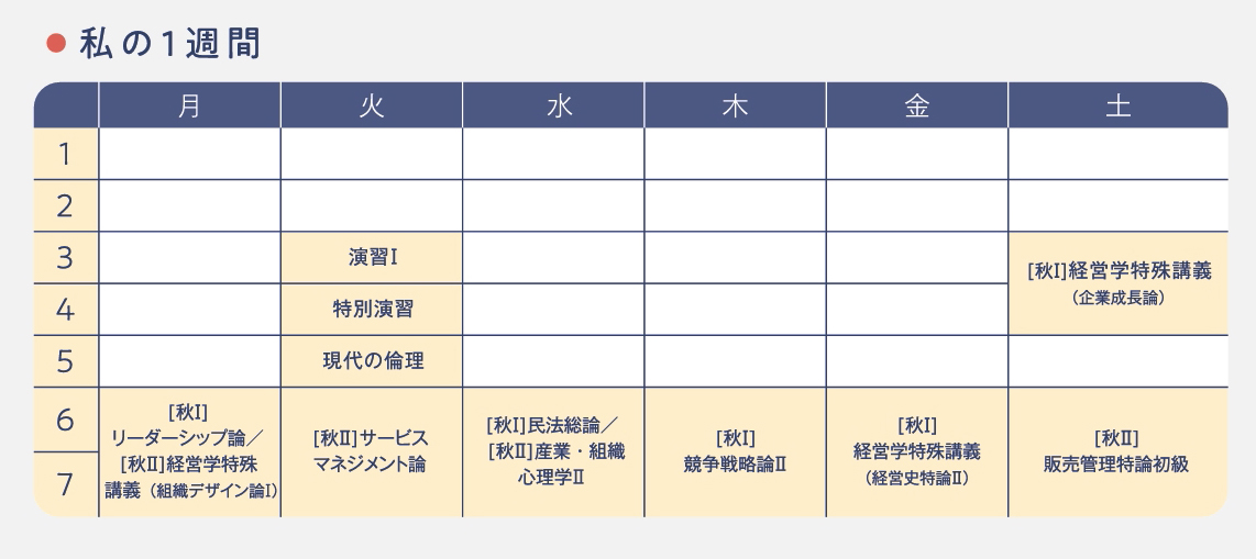 ※経営学部第2部の学科専攻科目は、平日6・7時限、土曜日4・5時限、6・7時限の2コマ連続で受講する授業です。