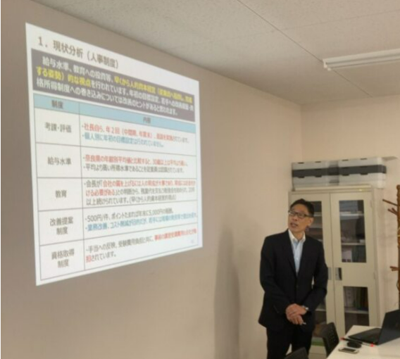 今回は、高山先生から現役金融機関勤務の2人に実習先企業の財務資料の概要を説明するよう指示がありました。2人の的確な説明を受け、皆で概況の把握ができました。