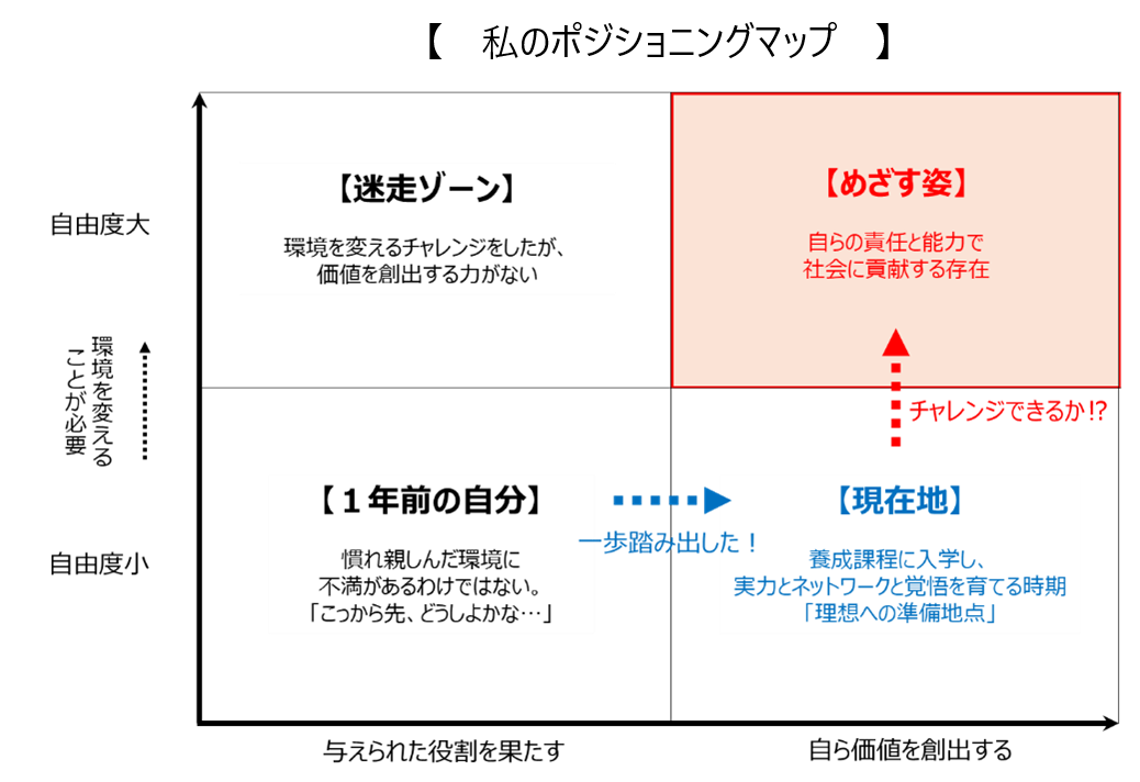 左下が1年前の自分。慣れ親しんだ環境で、経験も実績も積み重ねてきたけど、組織の中で与えられた役割を果たしている存在。
