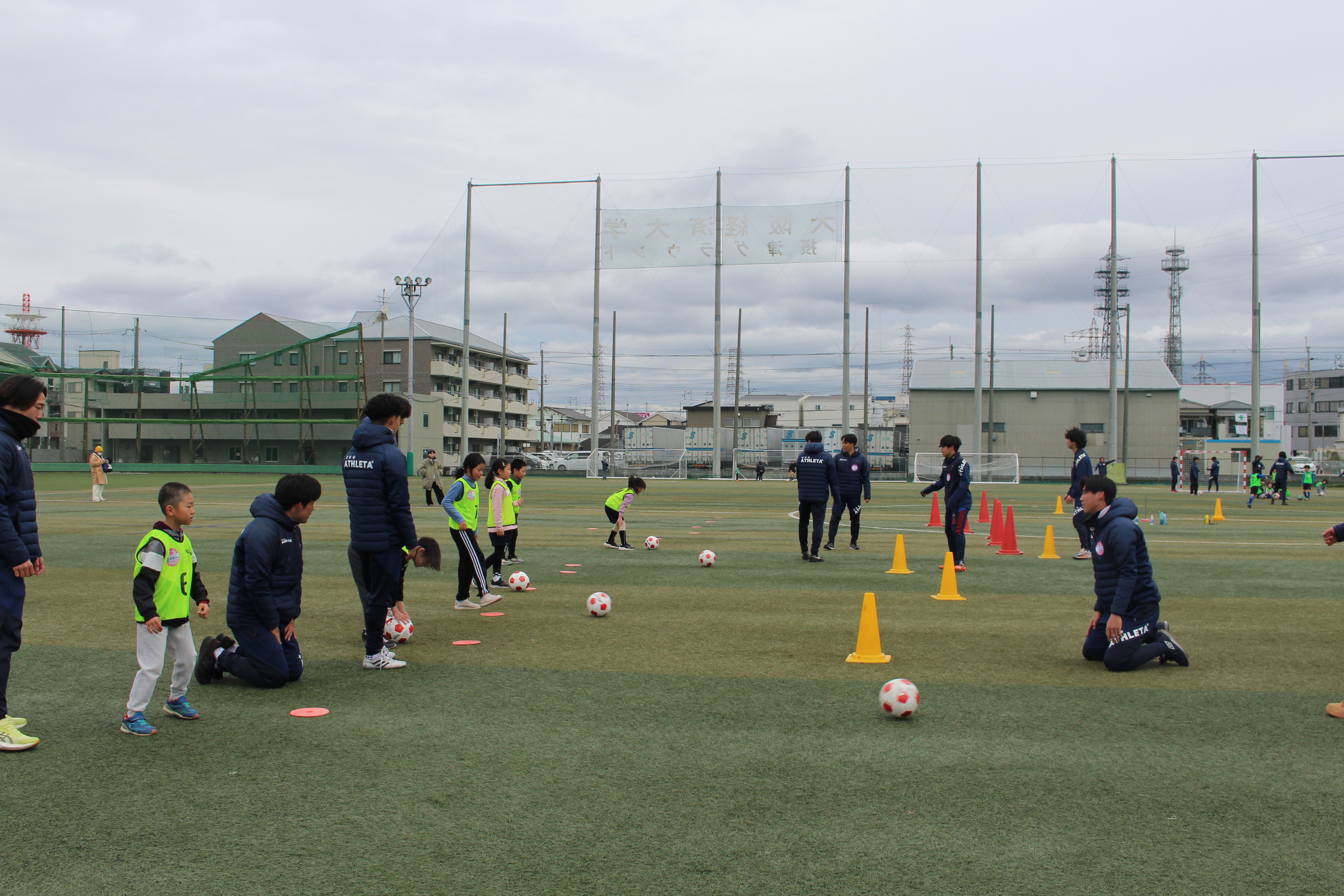 2026年2月7日(土)、本学摂津キャンパス南校地人工芝グラウンドにおいて、大経大キッズカレッジ2025『サッカー教室』を開催しました。経験の有無・学年問わず、本教室を通じてサッカーの楽しさを伝えるべく、本学体育会サッカー部が企画・指導を行いました。