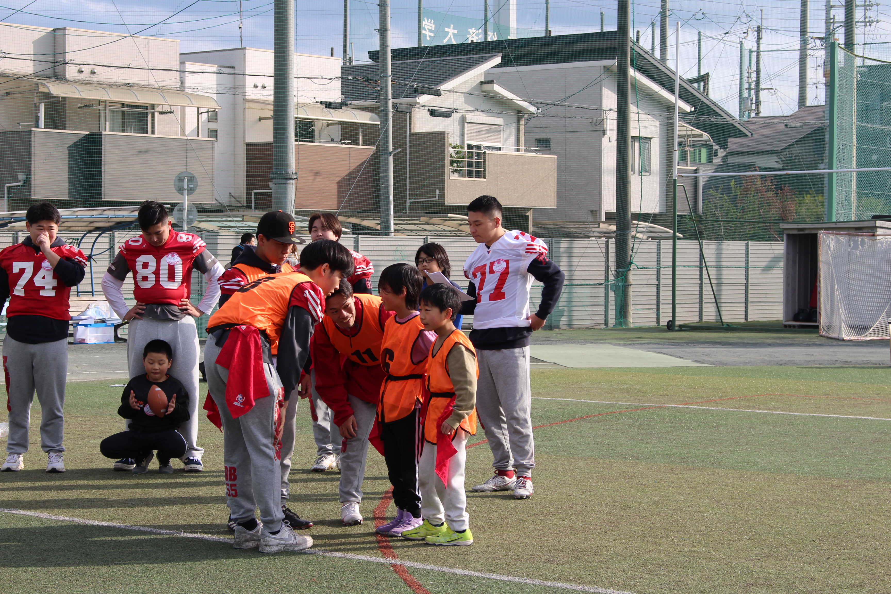 最後は大学生も交えて試合を行いました。フラッグフットボールは、攻撃の際は、作戦とチームプレーが重要です。チーム内で作戦を練って、ボールを持って走りきったり、仲間へのパスが通った際は、歓声があがりました。
