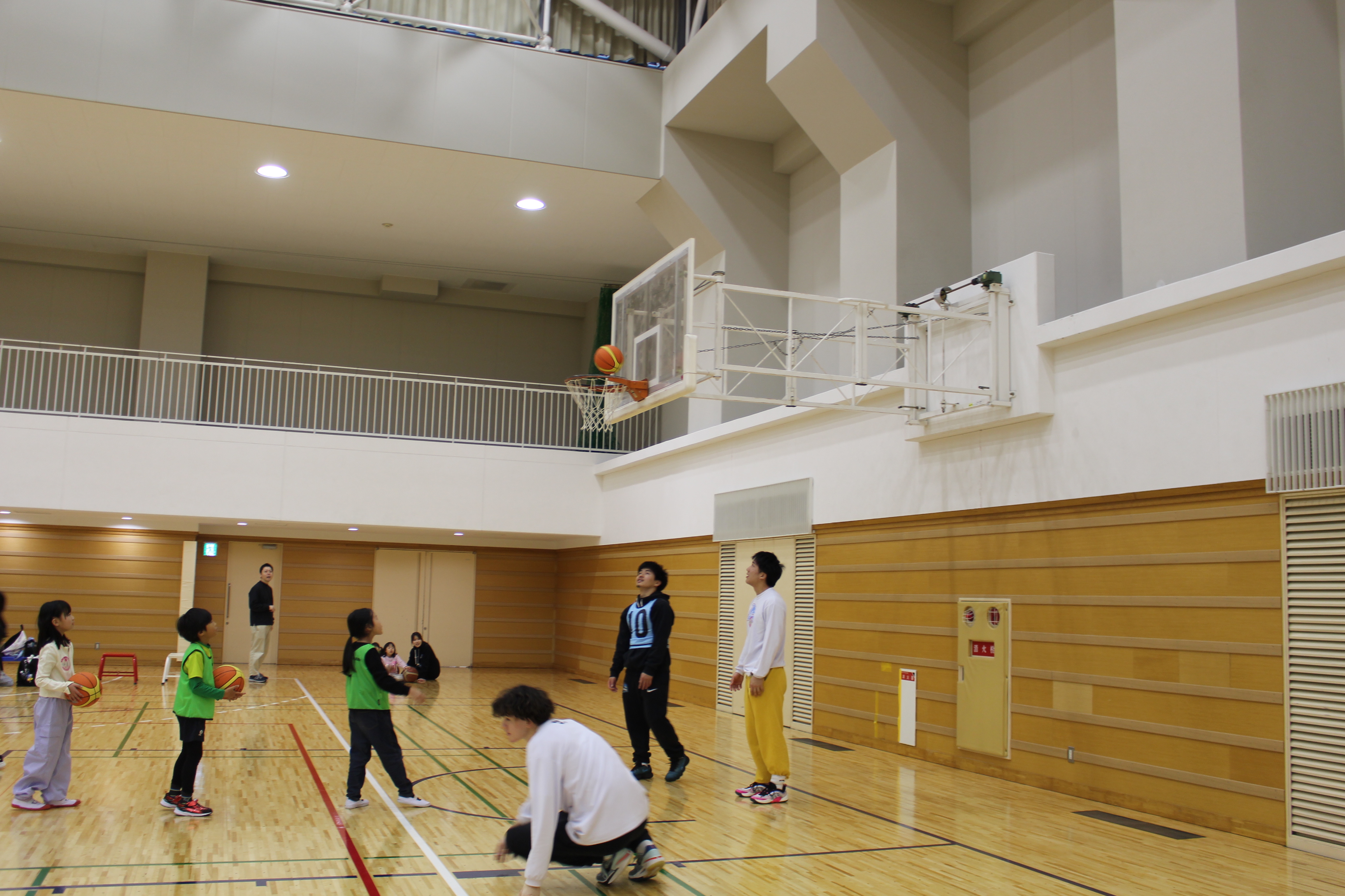 始めにストレッチを行ったあと、大学生が見本を見せながら、パス練習を行いました。パス練習の後は、ドリブル練習を行いました。基本のドリブルから、身体の後ろで行うバックチェンジなど、難易度が高い技も練習しました。続いて、シュート練習を行いました。ステップを意識しながら、レイアップシュートをしたり、パスをもらって近い距離からシュートしたりする練習をしました。