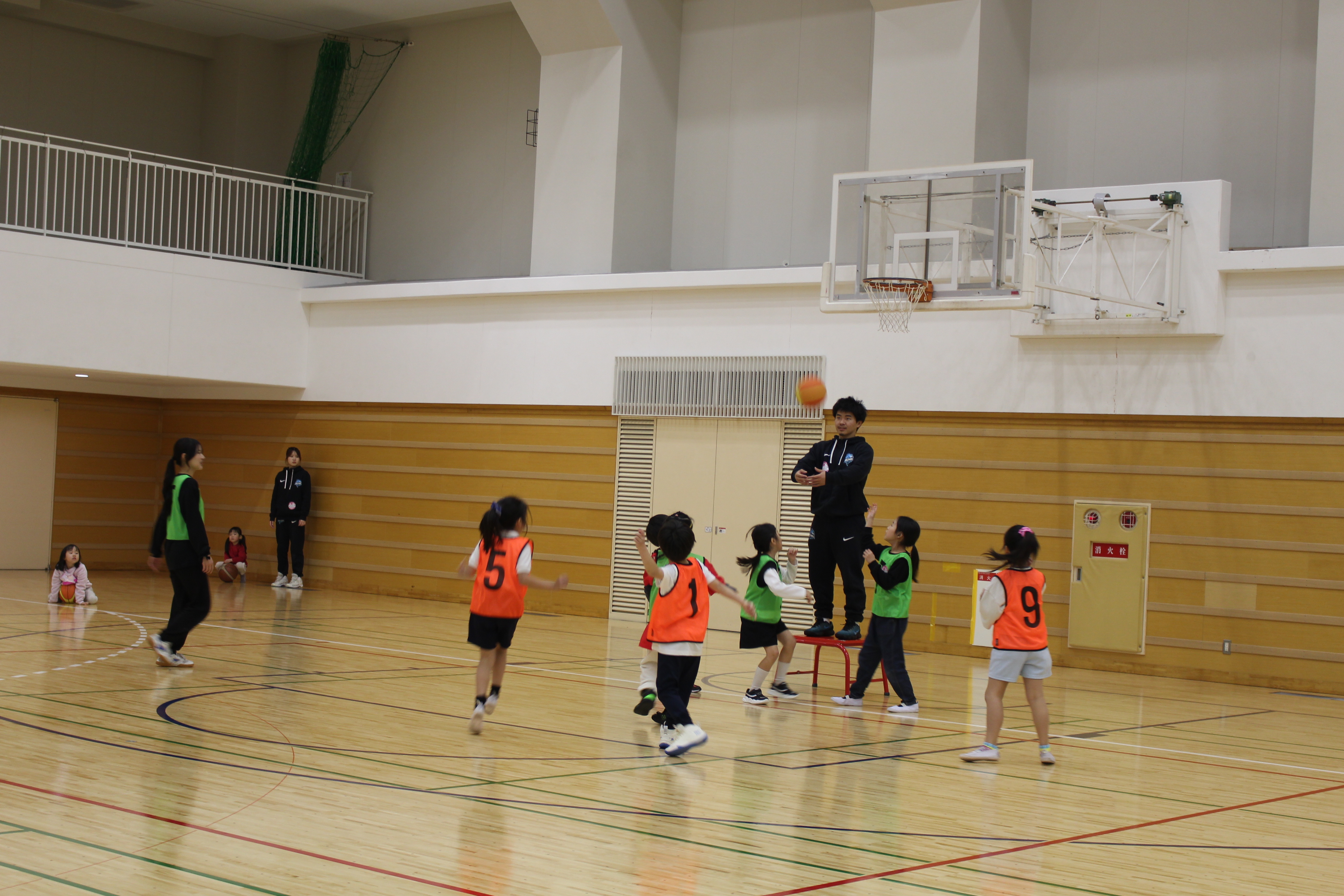 2026年2月14日(土)、本学大隅キャンパス体育館において、大経大キッズカレッジ『バスケットボール教室』を開催しました。本学体育会バスケットボール部が、参加者にバスケットボールの魅力を伝えるため、事前準備と当日の企画・指導を行いました。