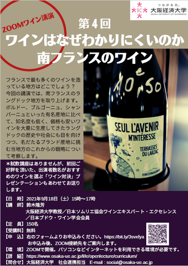 今回の講演では、南フランスのラングドック地方を取り上げます。ボルドー、ブルゴーニュ、シャンパーニュといった有名産地に比べて、知名度も低く、価格も安いワインを大量に生産してきたラングドックの歴史や社会に目を向けつつ、名だたるブランド産地に挑む当地方のこれからの戦略について考察します。