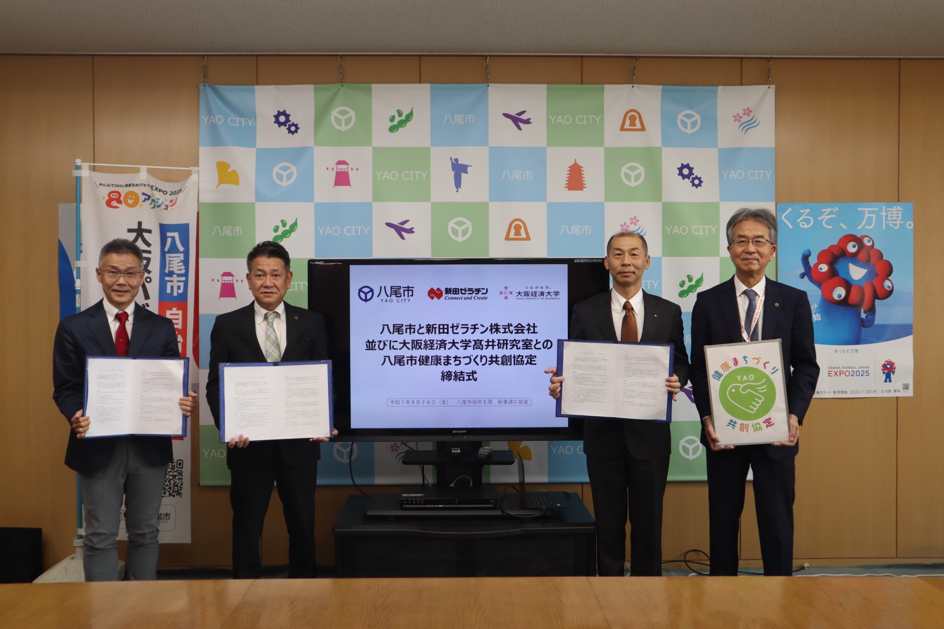 人間科学部髙井研究室は、大阪府八尾市が取り組んでいる健康寿命の延伸と健康コミュニティづくりを支援するため、八尾市および新田ゼラチン株式会社との間で、2025年9月26日に「八尾市健康まちづくり共創協定」を締結しました。