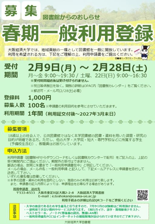 | 注意事項 | 利用証は更新制ではありません。年度毎に新たに登録となります。 大学の施設であるため学生優先となりますので、7月や1月の試験期はご利用頂けません。 一部利用できない資料やサービスがあります。(旅行ガイド、語学・資格関係テキスト、ベストセラー本、ノートPCの貸出、無線LAN等) 一般利用者優先端末にはインターネットの閲覧制限が設けられていますのでご了承下さい。 |