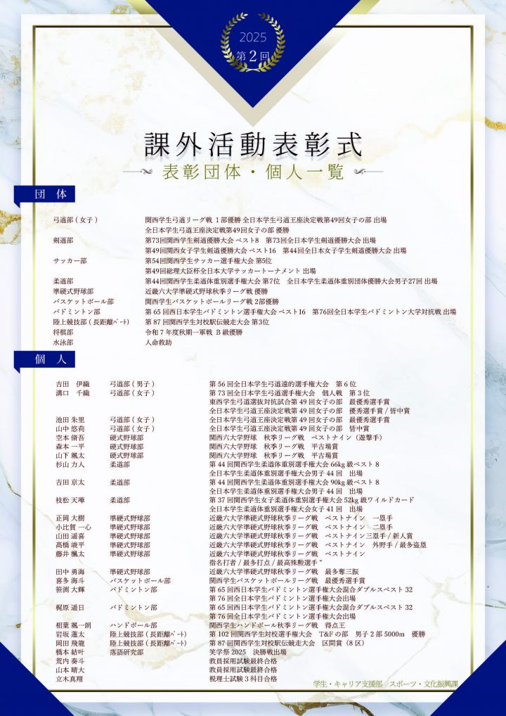 2026年1月14日(水)、「2025年度 第2回課外活動表彰式」を執り行い、クラブ10団体および、個人26名を表彰しました。今回は、全国大会での活躍だけにとどまらず、水泳部員たちによる人命救助や落語研究部員の「笑学祭 2025」(主催:ワタナベエンターテインメント)決勝戦出場など、多岐にわたる学生の功績を表彰することができました。