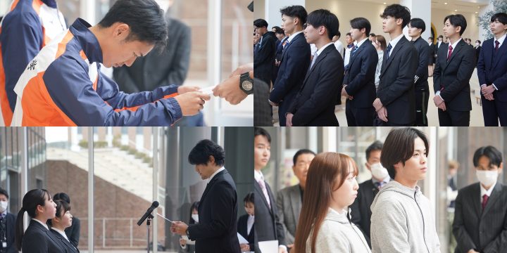 今回の代表挨拶は、団体・個人の両方で表彰となった弓道部(女子)主将の溝口千織さん(経済学部3年)が務めました。「この度、弓道部(女子)は、長年目指し続けてきた王座での優勝を果たすことができ、個人としても、その一助となることができました。こうして表彰していただき、光栄に思っています。支援してくださるたくさんの方々への感謝の気持ちを忘れず、また良いご報告ができるよう精進してまいります」という溝口さんの挨拶で、式は締めくくられました。