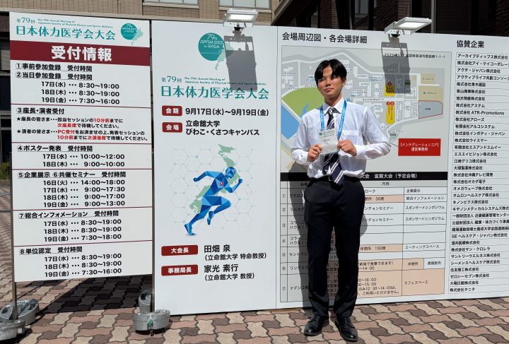 2025年9月17日(水)~19日(金)、立命館大学 びわこ・くさつキャンパスで「第79回 日本体力医学会大会」が開催され、人間科学部・江藤幹ゼミの藤原悠成さん(4年生)が発表者として参加しました。藤原さんは、本学陸上競技部の選手たちを研究対象に、「長時間高強度運動の習慣化と食欲調整機能の関係」について研究を重ね、学会という大舞台でその成果を発表しました。