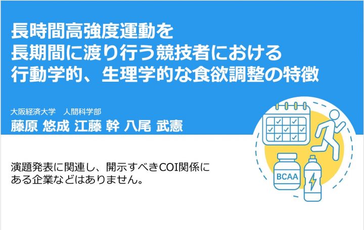 藤原さんは、スポーツにおける相対的エネルギー不足(RED-S)に着目して卒業研究を進めています。エネルギー不足が多く報告される種目の選手たちの食欲調整機能の特性を明らかにすることで、その解決を目指すというのが研究の趣旨です。意義ある学会発表にすべく、人間科学部の八尾武憲教授や江藤幹准教授のサポートも得ながら、念入りに準備やシミュレーションを重ねました。