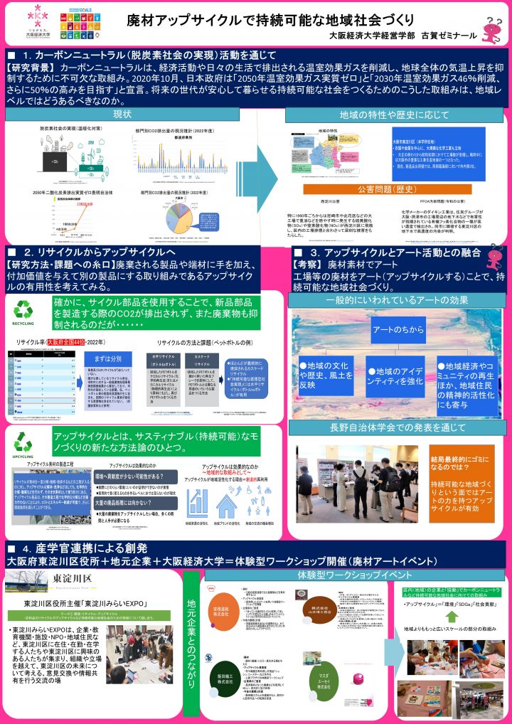 古賀ゼミは、大阪市東淀川区役所主催「第11回東淀川みらいEXPO~カケルヒガシヨドガワ2~」で交流のあった東淀川区内の企業とタッグを組み、地域レベルでのカーボンニュートラル(脱炭素社会の実現)活動に力を注いでいます。具体的には、区内企業から廃材を提供していただき、かみしんプラザ(大阪市東淀川区)にてアート製作イベントを実施するなど、アップサイクルとアートの親和性を活用した取り組みを行ってきました。