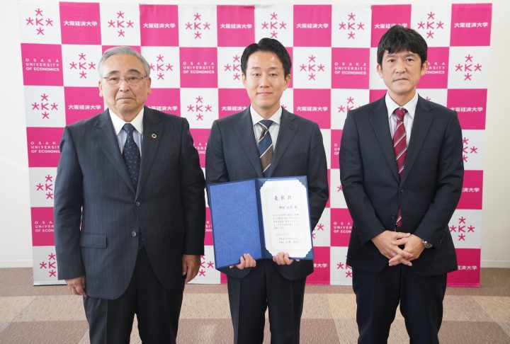 今年度は、人間科学部の坪田祐季准教授が選出されました。表彰式では、山本学長より受賞者の発表および授賞理由の説明が行われた後、山澤理事長より表彰状が授与されました。