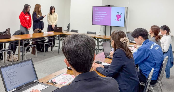 2025年12月22日(月)、経済学部の臼田利之ゼミの学生が、大阪市役所 建設局公園緑化部の担当者に対し、ゼミ活動の一環として取り組んできた「東淀川区公園魅力向上プラン」について報告を行いました。