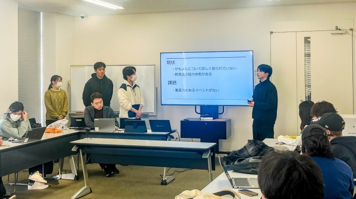ゼミ生は4グループに分かれ、「イベント会社の社員」という設定で企画を立案しました。企画の条件は、蒲生四丁目の活性化、地域内外からの集客、古民家再生店舗が一体となる内容、2026年度中の実施です。各グループは、ターゲット、企画内容、広報手段、当日の運営方法などを具体的に検討し、プレゼンテーションを行いました。