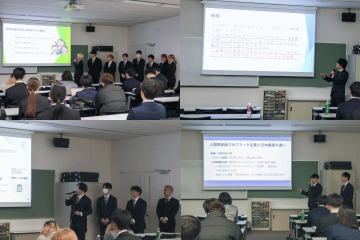 学生たちも、「仕事はお金を稼ぐことだと思っていたけど、職場の人間関係も大事だと気づいた」「社員一人一人を成長させようという社長の話を聞いて、ただ楽なだけではなく、自分を成長させてくれる企業こそが本当に働きやすい職場なのだと考えが変わった」「身体的な働きやすさだけでなく、精神的な安心感も大事なのだと実感した」と、プレゼンテーションを終えて、意識の変化を語っていました。