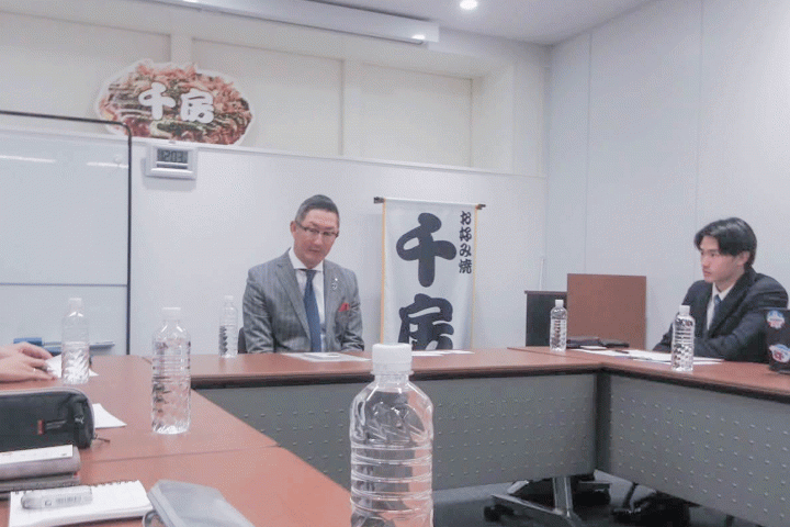 最初のチームは、お好み焼き「千房」を展開する千房ホールディングス株式会社を取材しました。学生たちは、社員を家族のように大切にする社風や社長が社員のために誰よりも働く「逆ピラミッド」体制を紹介。