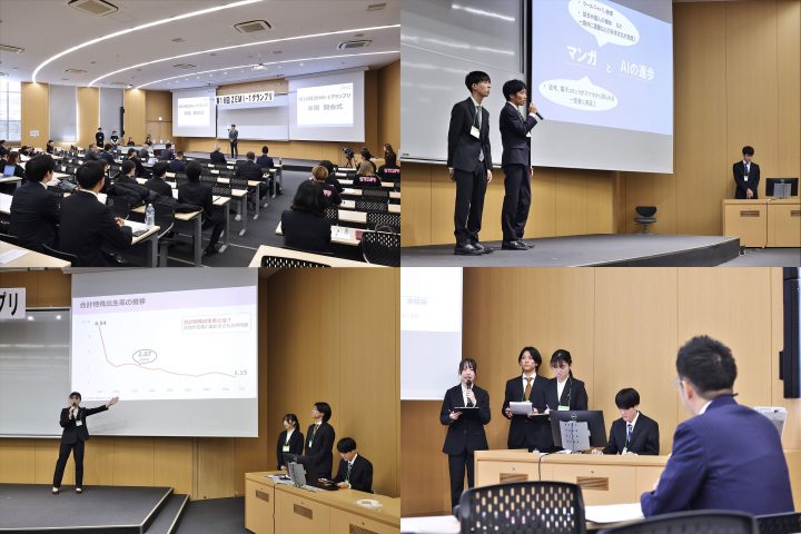 審査には企業の経営層や人事担当者にも参加いただき、実社会の視点から鋭いコメントが寄せられるなど、学生にとって大きな学びの場となっています。今年は予選に全60チームが参加し、学問分野を越えて社会課題に挑む多様な研究が披露されました。予選を勝ち抜いた12チームが本選で発表を行い、会場には熱気と緊張感が広がりました。