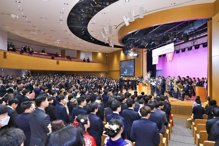 式典は、吹奏楽総部による卒業生の門出を祝う演奏で華やかに幕を開けました。その後、来賓、学長、理事長、副学長、学部長、研究科長が登壇し、山本俊一郎学長より、学部の総代に卒業証書と黒正賞の賞状・記念品、研究科の総代には学位記と黒正賞の賞状・記念品が授与されました。