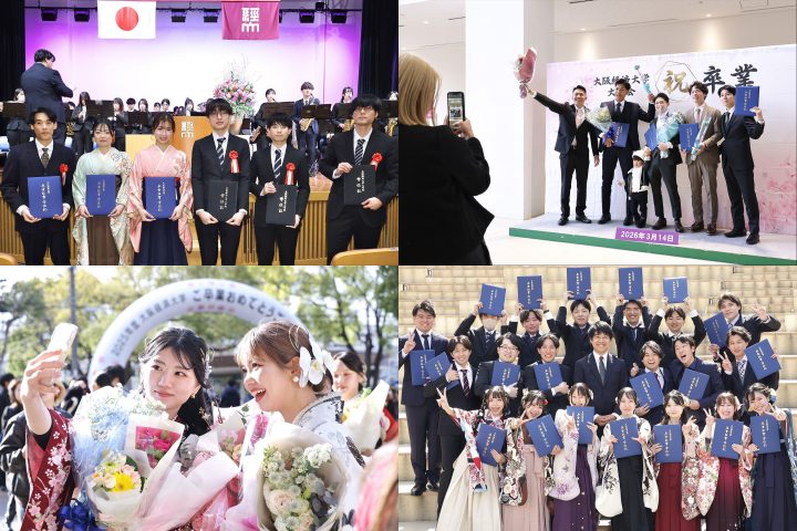 2026年3月14日(土)、大阪経済大学 A館フレアホールにて2025年度卒業式・学位授与式が執り行われ、1,557名(学部1,489名、大学院68名)に学位が授与されました。