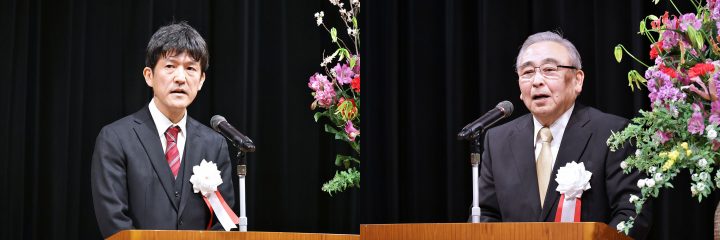 続いて、山澤倶和理事長は、本学が2032年に100周年を迎えること、また2026年が昭和100年という節目の年であることに触れ、これからの時代は卒業生一人ひとりが新たな価値観を築いていく時代であると述べました。そのうえで、万博やオリンピックといった大舞台だけでなく、日々の会社や職場の中で「明日をより良くする」ことを思い描きながら行動し、未来社会の形成に主体的に関わっていく姿勢の重要性を強調しました。これからの社会を切り開いていく人材としての気概を持ち、それぞれの場で社会づくりに参画していくことへの期待が寄せられました。