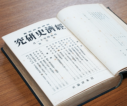 日本経済史研究所では毎月研究会を開催し理事や所員の研究発表を行うほか、講演会や展示会の開催、機関誌『経済史研究』の発行、図書の編纂・出版など様々な事業を展開しました。なかでも『経済史研究』は、国内はもとより海外の研究者にも研究所の存在を知らしめることになった、代表的な事業です。毎号に「最近の経済史学界」と題して文献一覧、書評・史料紹介などを収録し、毎年、前年に発表された経済史関係の著作や論文を収録・解題した「経済史年鑑」を特集号として発行し、一研究所の機関誌を超えて「日本経済史学界の機関誌」の役割を果たしました。