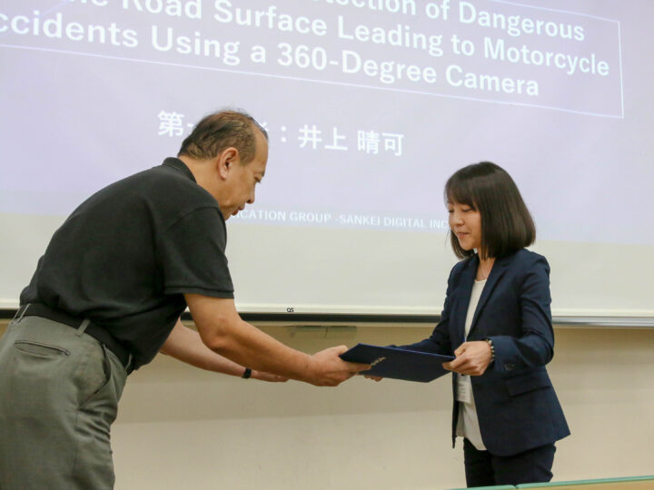 井上准教授の発表は、二輪車乗車中の事故低減を目指す研究についてであり、2種類の360度カメラを対象に,YOLOを用いて動画像から路面上の危険物を検出する手法を適用し,異なる条件下で検証したものです。この手法は、カメラの種類、解像度、YOLOのバージョンなどの条件が異なる場合において、概ね正確に危険物を検出できることが確認され、汎用性の高い技術として高く評価されました。