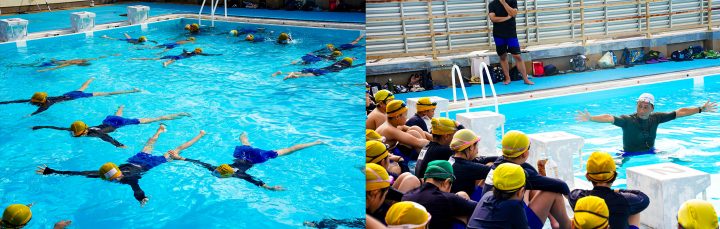本研究の目的は、小学生を対象に若吉教授が自ら開発した水泳補助具「フラットヘルパー(※)」を活用し、「安全水泳」と「泳法習得」という二つの要素を取り入れた水泳授業(出前授業)を実施し、その学習内容と指導方法が“泳力の二極化問題”の解消につながるかを検証することにあります。泳げる子どもと泳げない子どもが同じ授業に参加する学校水泳は、教員にとって非常に難しい課題であり、本研究はその解決に取り組んだものです。