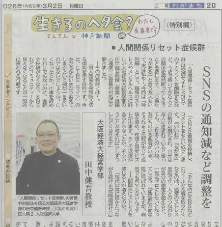 2026年3月2日(月)神戸新聞(朝刊)の「生きるのヘタ会?てんてん×神戸新聞」のコーナーで、人間関係についての取材コメントが掲載されました。